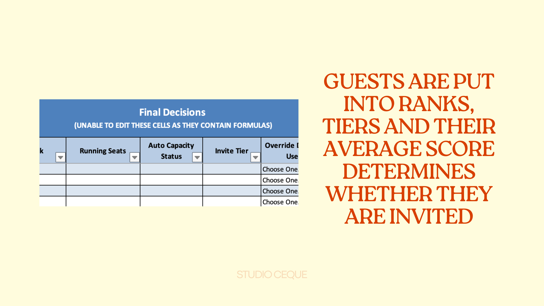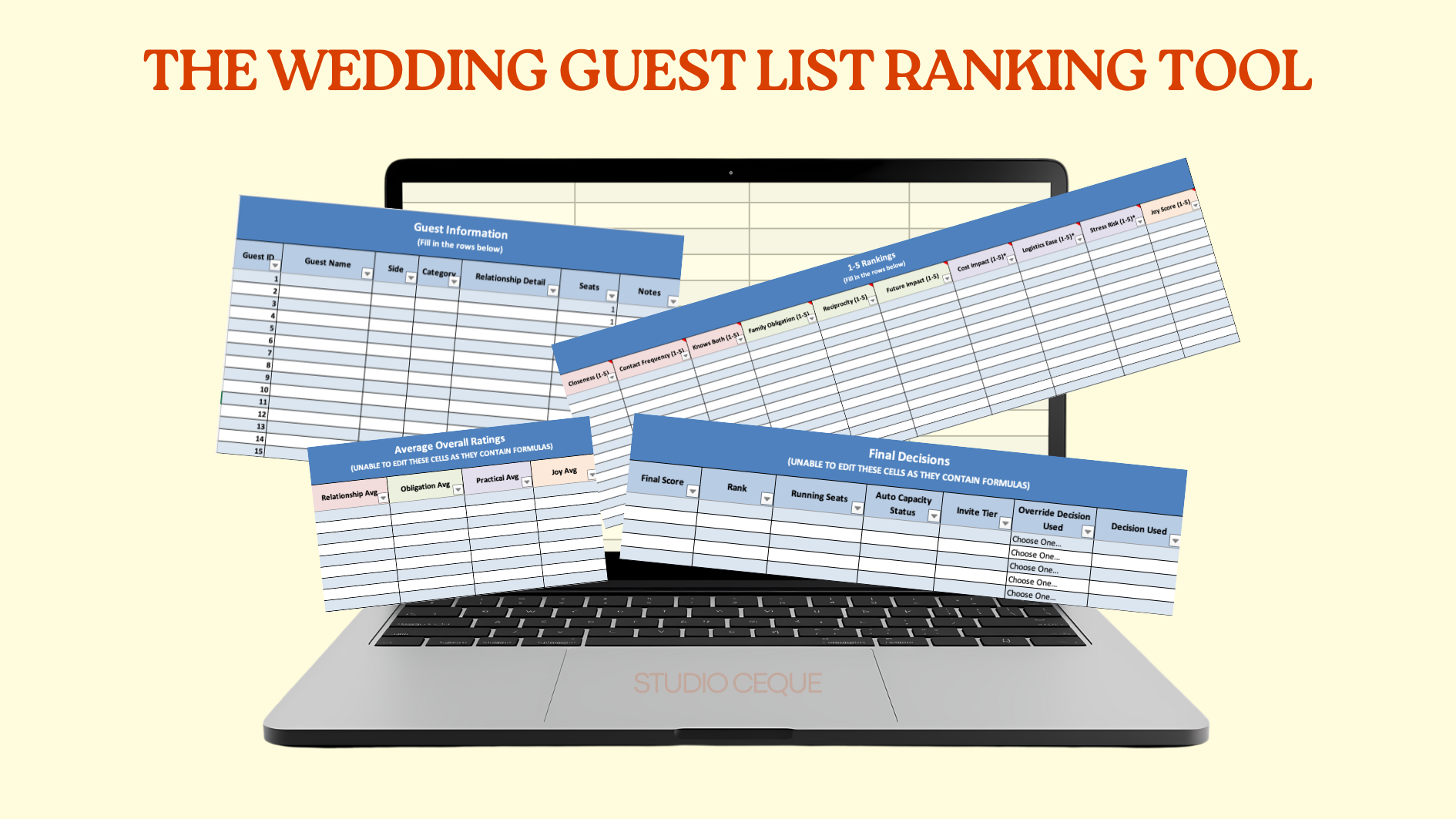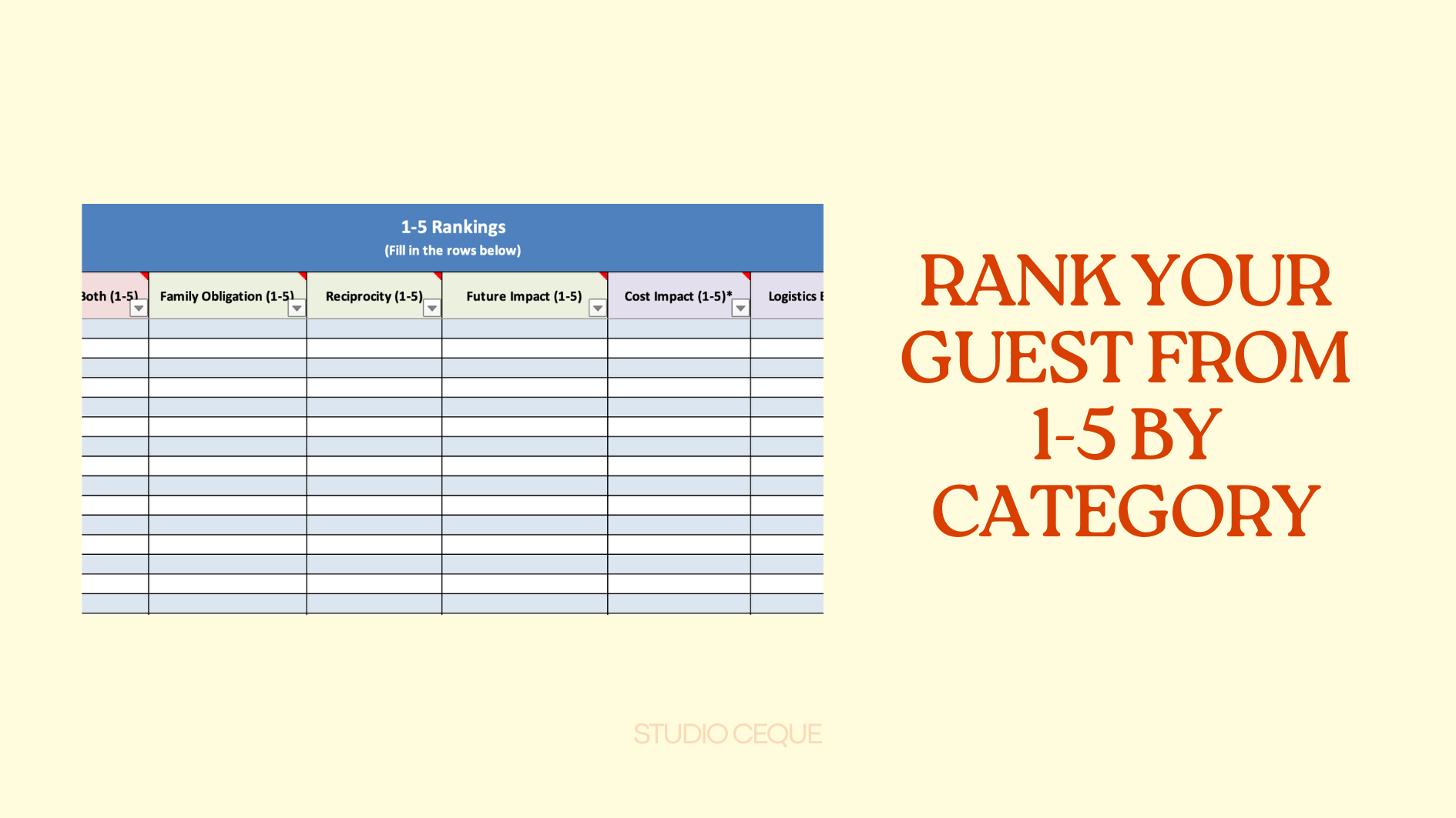 A structured Excel tool designed to help you decide who to invite to your wedding — calmly, fairly, and without guilt.